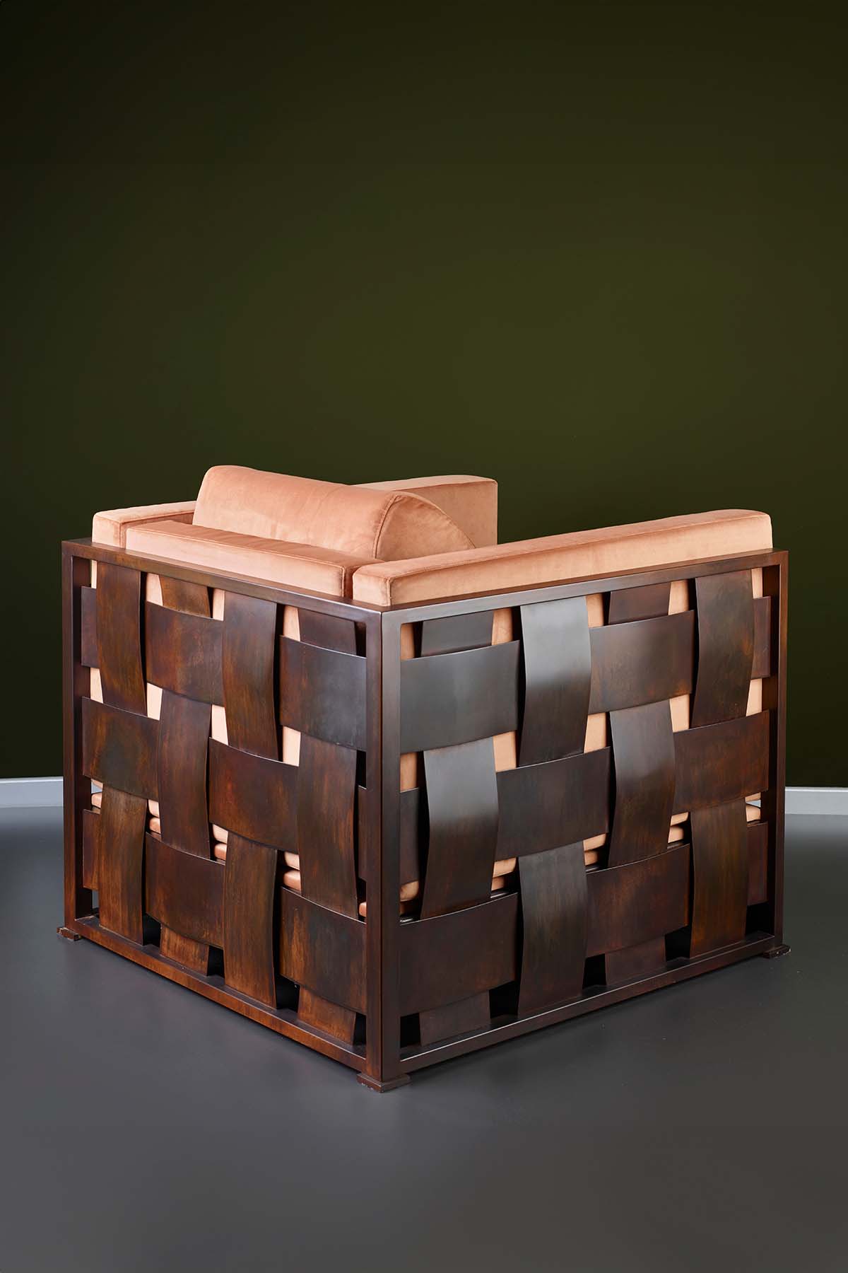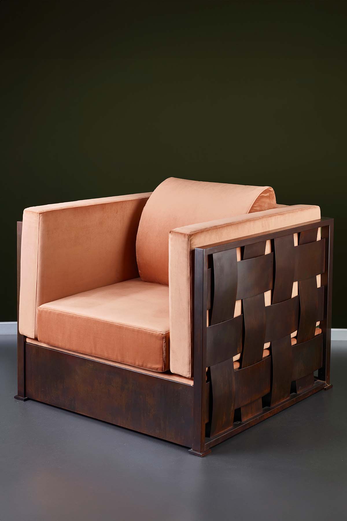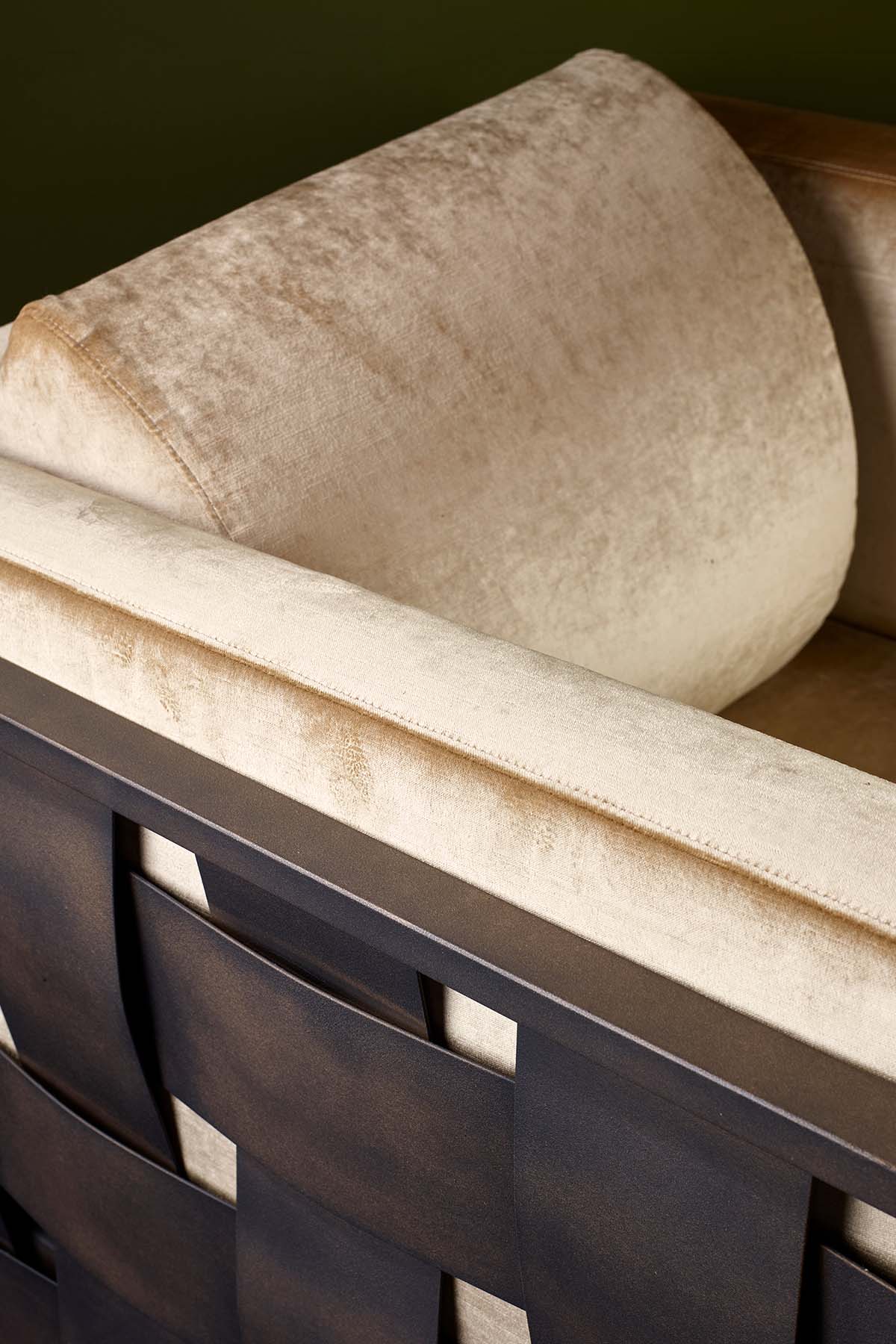 Poltrona e divano in metallo finitura a scelta cuscini con tessuto a scelta